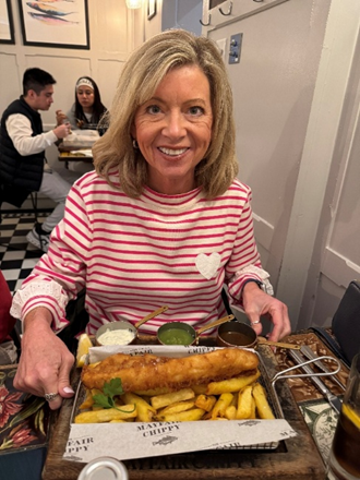 The next day brought more shopping and a lunch so legendary it may require its own ballad: fish and chips at the Mayfair Chippy. The cod was golden and flaky, the chips were perfectly crisp, and the supporting cast of tartar sauce, lemon wedges, malt vinegar, mushy peas, and curry sauce deserved an ovation. We dined early and were seated at a fun table near the galley, ideal for people watching and hearing, with delight, as the captivating and lively accents (and phrases) filled the air. When we departed around 1:15, the place was packed, with hopeful diners being gently, but firmly, turned away. Moral of the story: book ahead or live with regret.